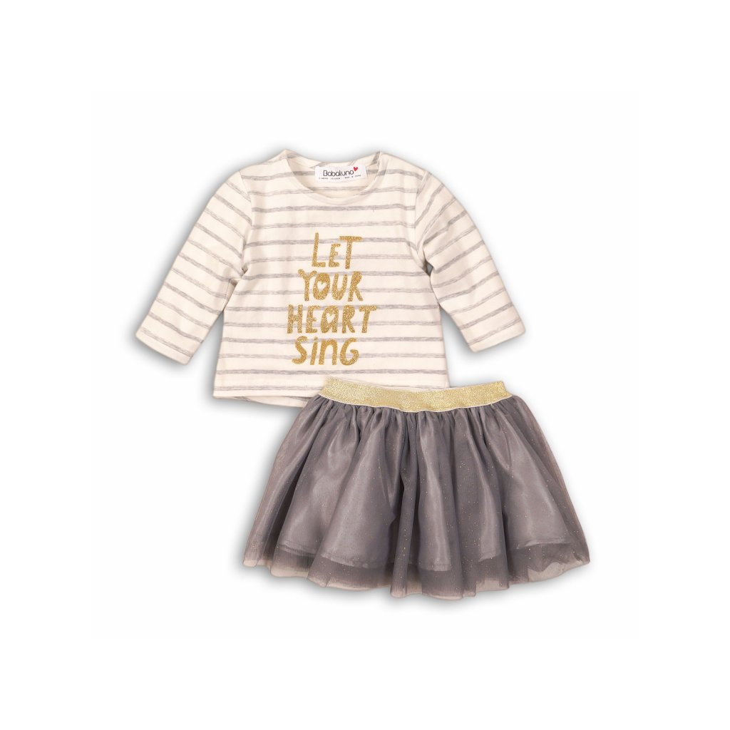 Dívčí souprava je v krémovém provedení. Souprava obsahuje tričko Pruhy a krásnou sukni. Materiál trika 100% bavlna, sukně je z polyesteru. Dětské oblečení je kvalitní značky Minoti.