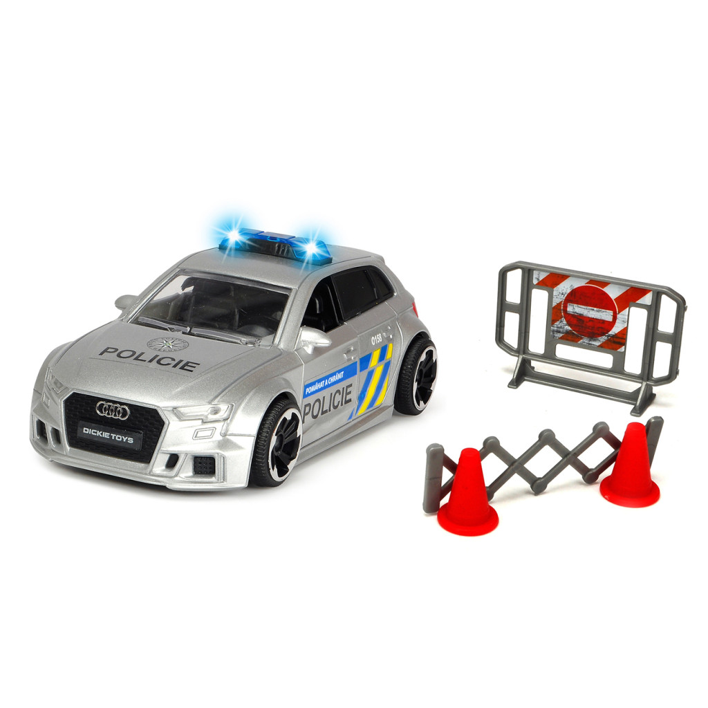 Policejní auto Audi RS3 na setrvačník, se světelnými a zvukovými efekty a otevíracími dveřmi. Příslušenství - zastavovací pás, dopravní kužely, zábrana. Velikost 15 cm, měřítko 1:32. Česká verze.
