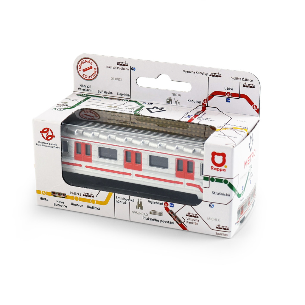 Originální hračka vytvořená ve spolupráci s hlavním městem Praha a Dopravním podnikem hlavního města Prahy. Délka metra je 8,5 cm. Tento jedinečný kousek se určitě stane oblíbenou hračkou všech malých nadšenců městské hromadné dopravy nejen v Praze. Navíc lze jednotlivé soupravy jednoduše zapojit za sebou. Jezdí na volný chod. Metro má rozchod kol cca 1cm.