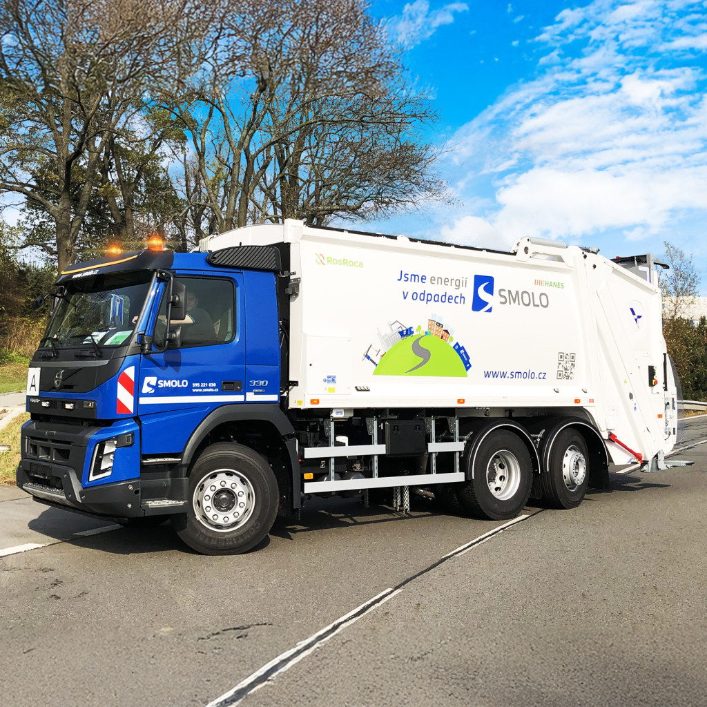 Kovové popelářské auto s plastovou korbou a logem SMOLO. Korba má v zadní části odklápěcí dveře, součástí je otevírací popelnice. Auto jezdí na zpětný chod a jeho délka je 15 cm.