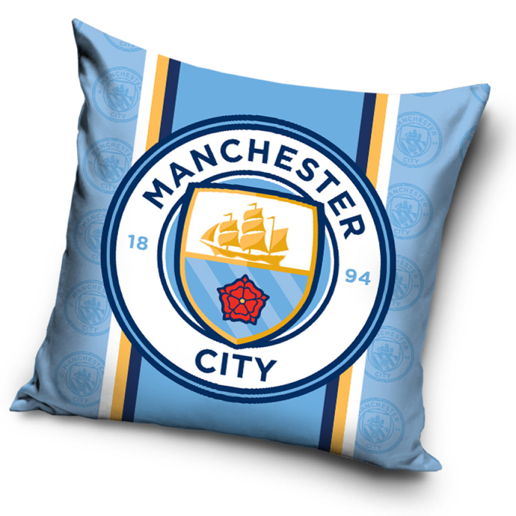 Fotbalový povláček Manchester City Triplet, je nebesky modré barvy, s drobnými, klubovými znaky. Rozměr polštářku je 40x40 cm. Povlak MÁ zip